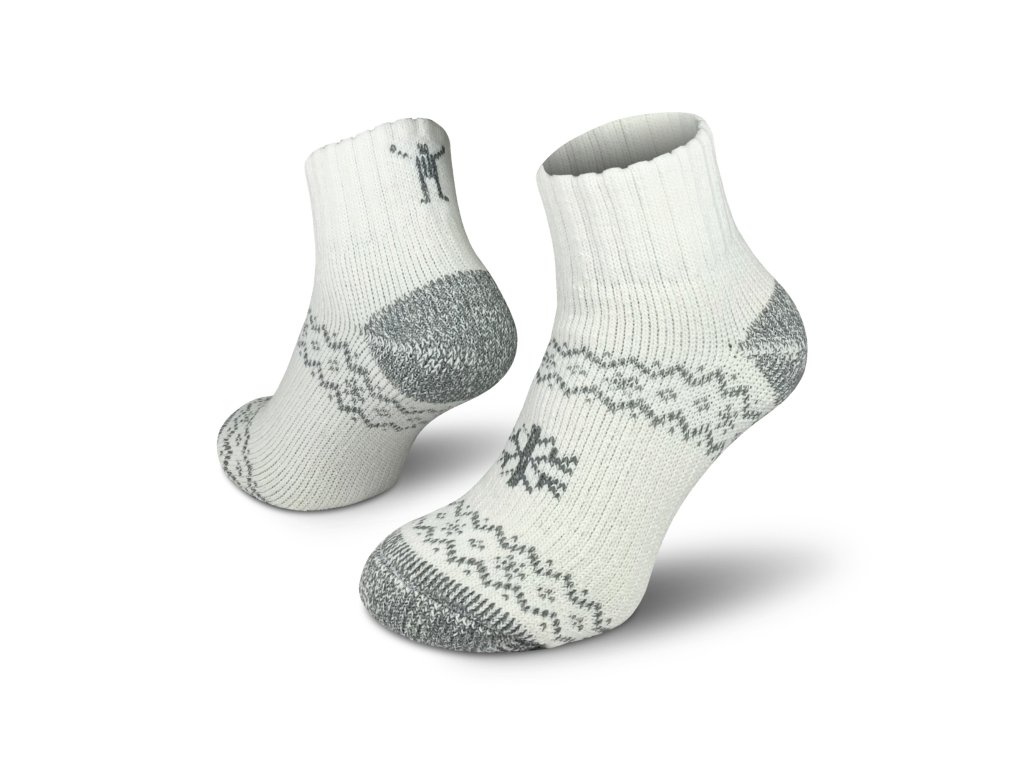 Domácí ponožky z merino vlny v bílé s šedým vzorem. Kombinace merino a alpaka vláken udrží vaše nohy v teple, suchu a pohodlí po celý den.