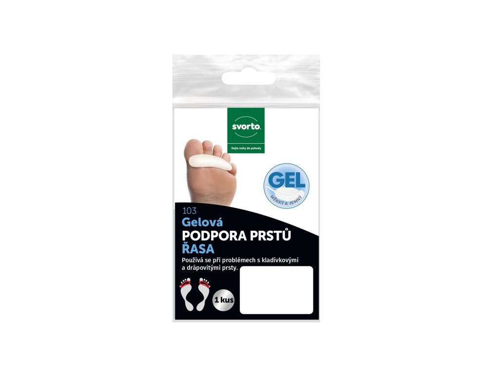 Gelová podpora prstů „ŘASA“ je určena pro osoby s problémy s kladívkovými a drápovitými prsty. Tento měkký a elastický gel, který je tvarován zvlášť pro levou a pravou nohu, pomáhá udržovat prsty v přirozené poloze, čímž zabraňuje jejich sevření a zhoršování deformace. Díky tomu se snižuje riziko vzniku otlaků a kuřích ok, protože prsty nenarážejí do obuvi.
