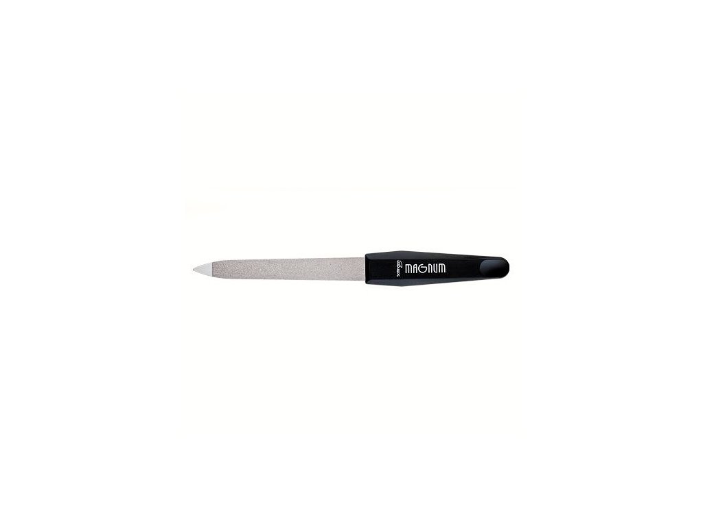 Oblíbený safírový pilník MAGNUM pro domácí manikúru a pedikúru. Délka 150 mm, s hrubou a jemnou stranou. Ideální pro tvarování a vyrovnávání nehtů. Černý kovový design. Pilujte pouze suché nehty pro optimální výsledky.